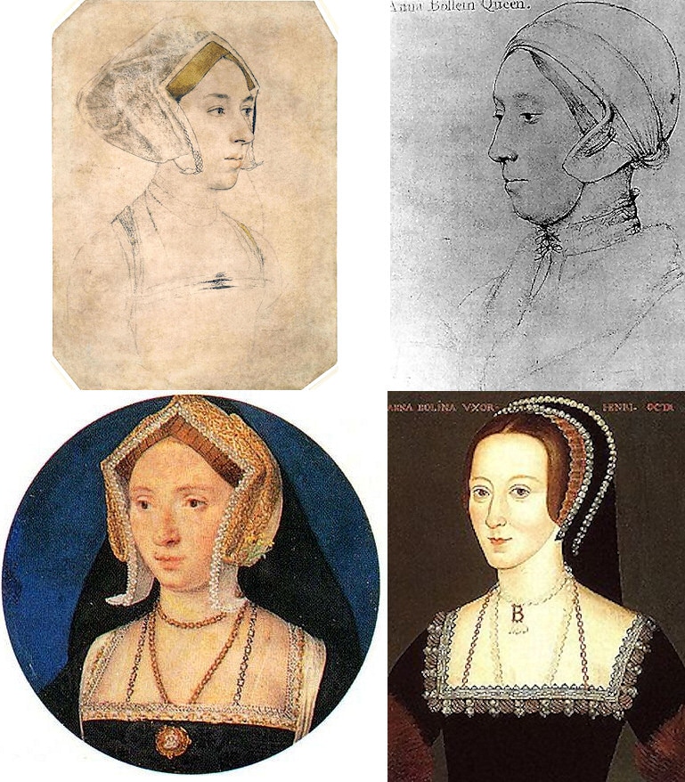 I think the two portraits on the left(both upper and lower)are not Anne Boyleyn but Jane Seymour.